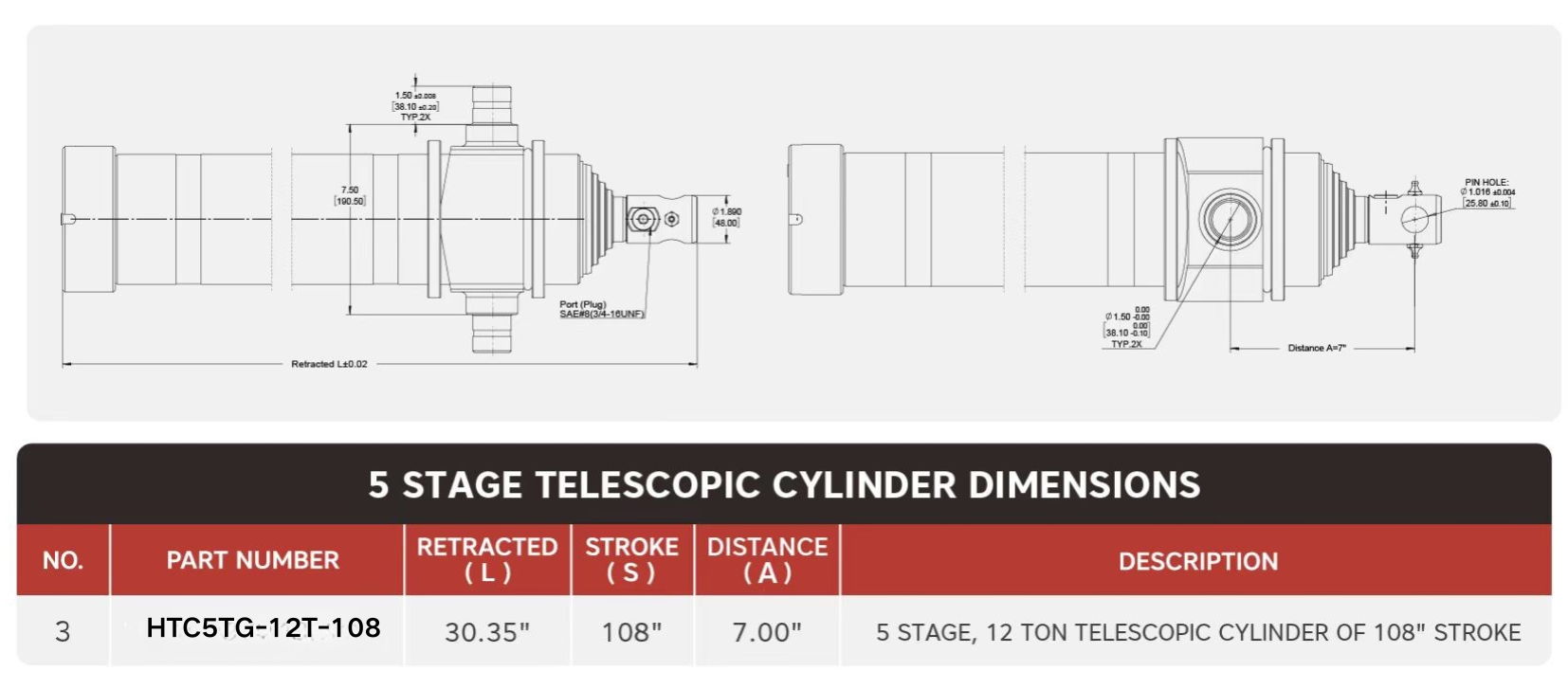 Cylinder teleskopowy „HTC5TG-12T-108”, 5-stopniowy, 12 ton o skoku 108 cali