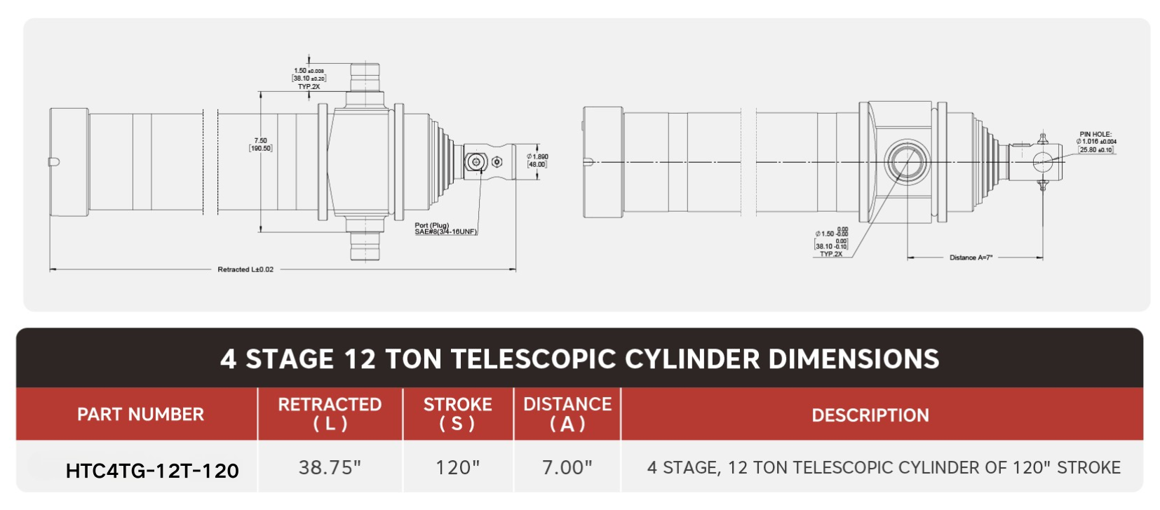 Cylinder teleskopowy „HTC4TG-12T-120”, 4-stopniowy, o udźwigu 12 ton i skoku 120 cali