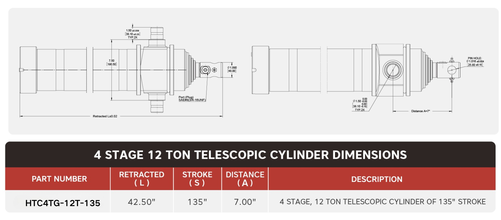 Cylinder teleskopowy „HTC4TG-12T-135”, 4-stopniowy, o udźwigu 12 ton i skoku 135 cali