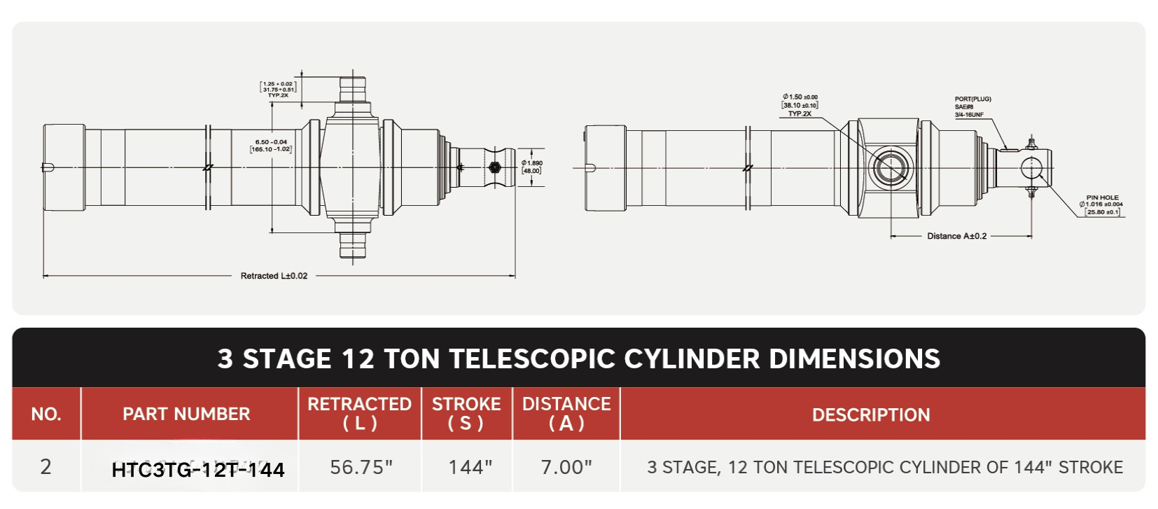 „HTC3TG-12T-144”, 3-stopniowy, 12 ton cylindrów teleskopowych o skoku 144 cali