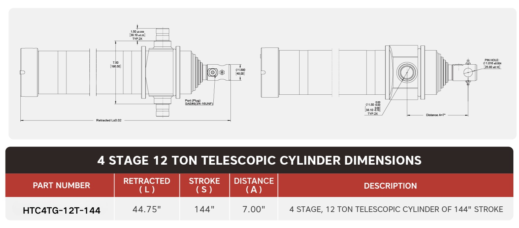 Cylinder teleskopowy „HTC4TG-12T-144”, 4-stopniowy, o udźwigu 12 ton i skoku 144 cali