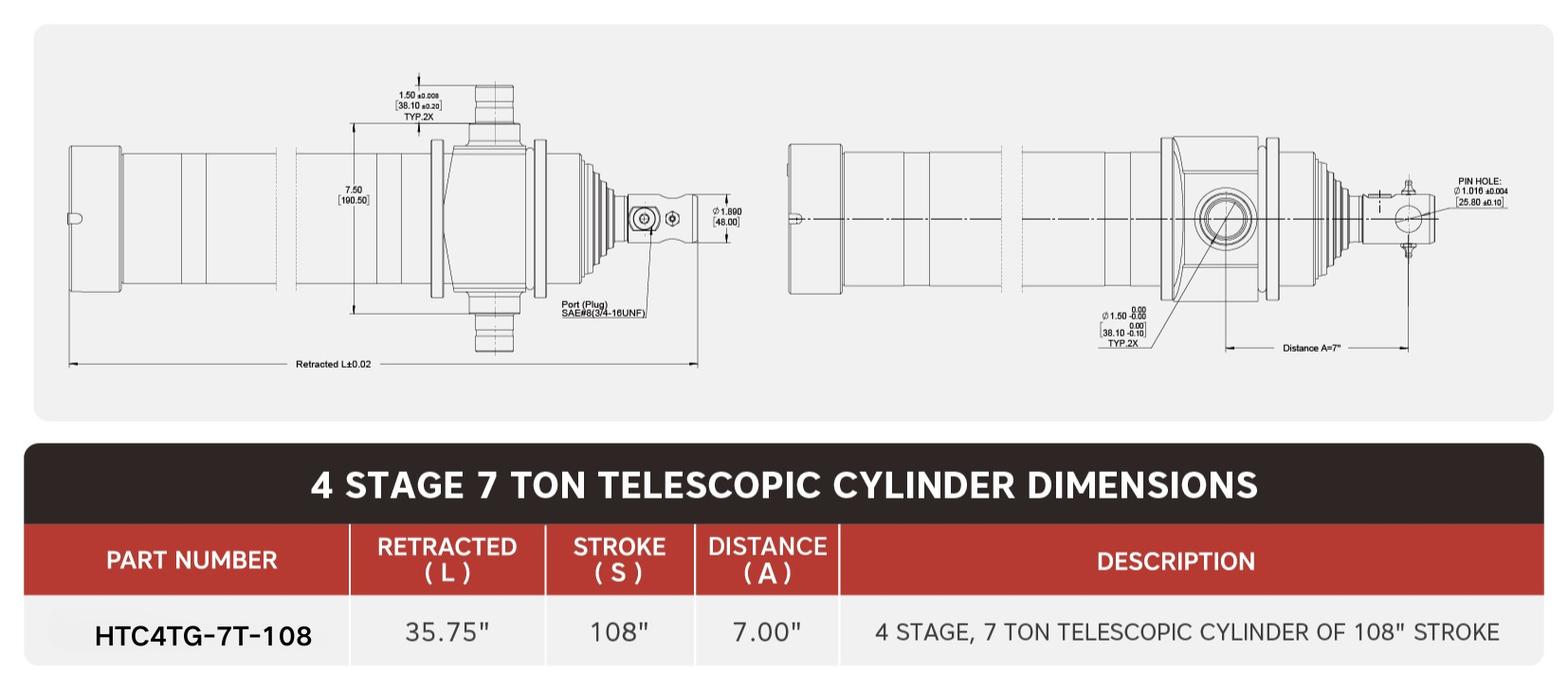 Cylinder teleskopowy „HTC4TG-7T-108”, 4-stopniowy, o udźwigu 7 ton i skoku 108 cali