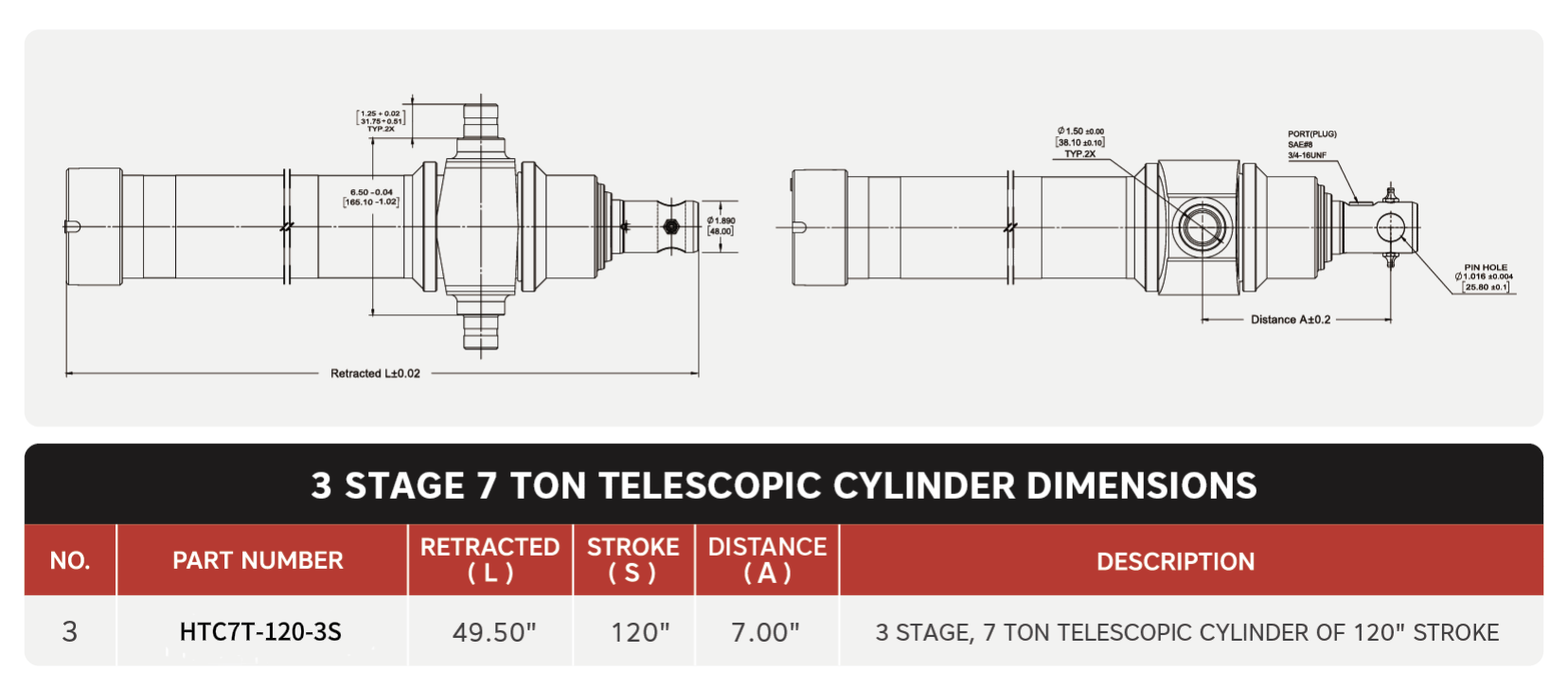 Cylindry teleskopowe „HTC3TG-7T-120”, 3-stopniowe, 7 ton o skoku 120 cali